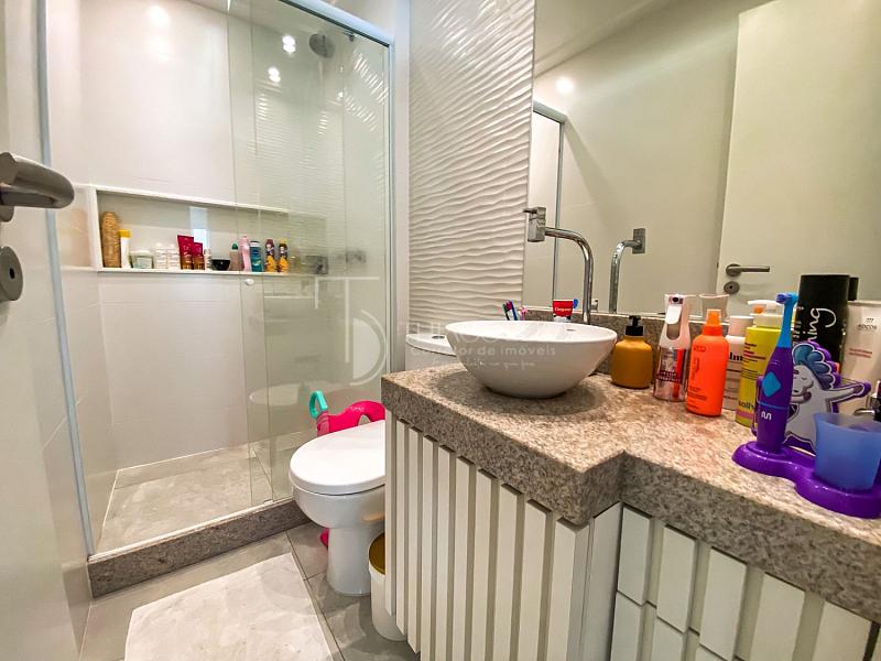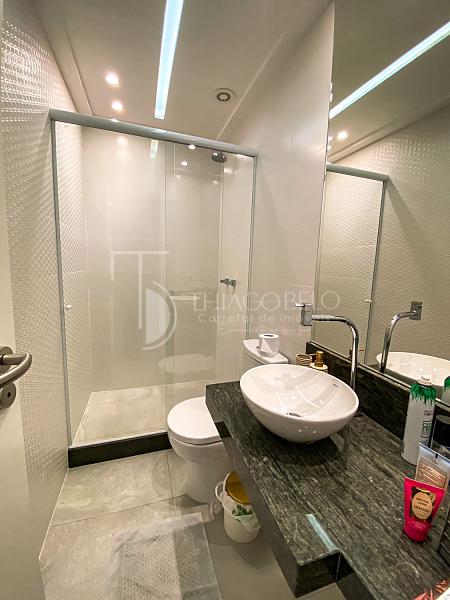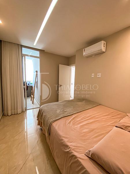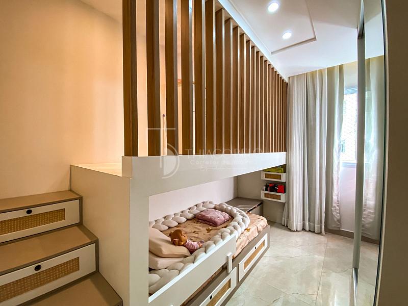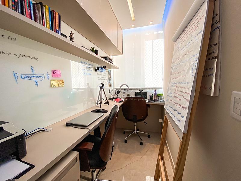 A suíte principal é espaçosa e conta com um escritório integrado, que também pode ser utilizado como  closet, proporcionando praticidade e conforto.