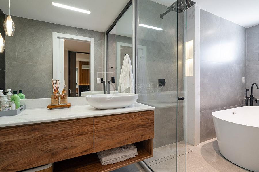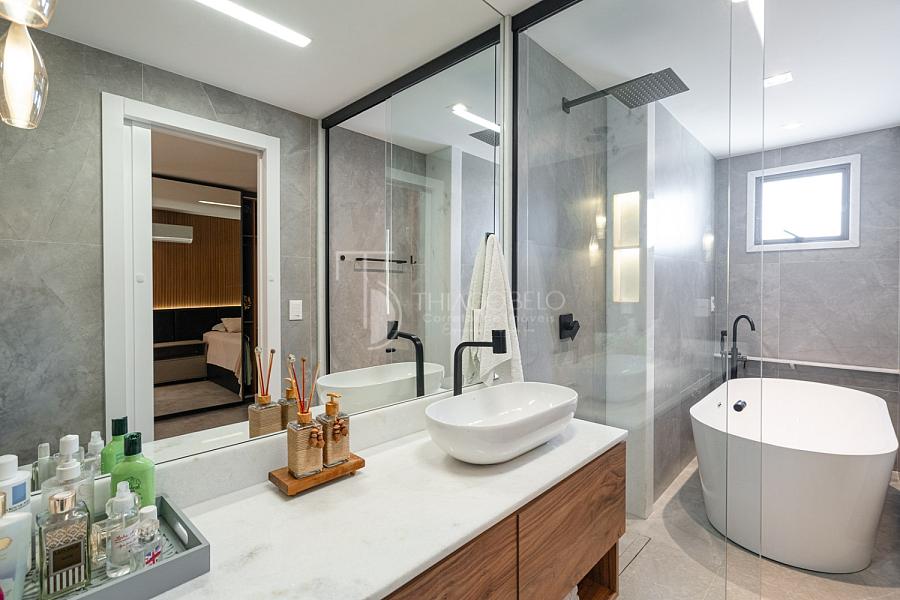 Imagine-se desfrutando de duas suítes luxuosas, cada uma delas projetada para oferecer o máximo de conforto e privacidade. Uma das suítes possui um banheiro com banheira importada, torneira importada, um convite para relaxar e descontrair após um longo dia. E para garantir o seu bem-estar em todas as estações, o apartamento é totalmente climatizado, proporcionando um ambiente agradável e acolhedor durante o ano todo.