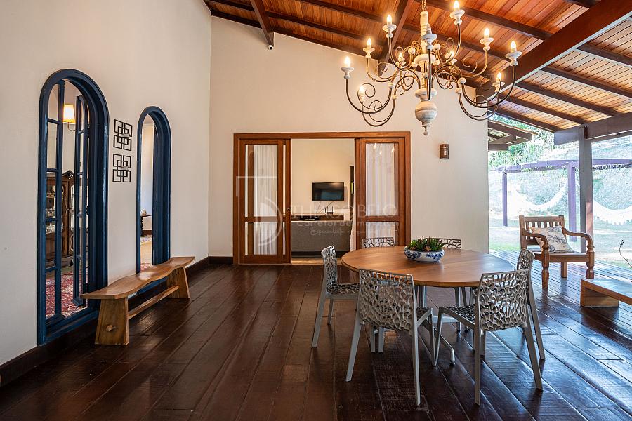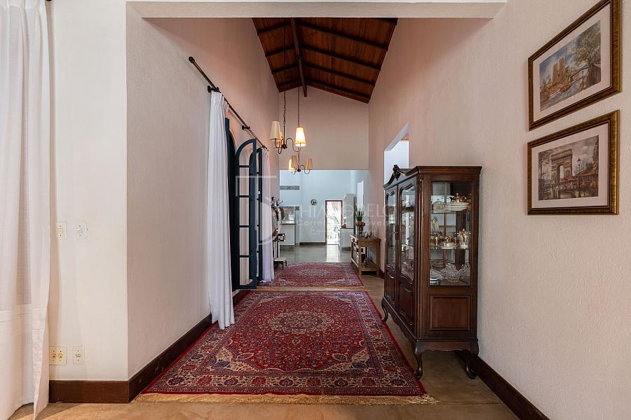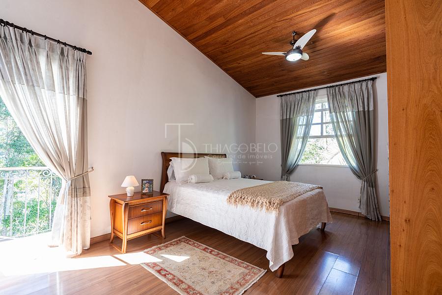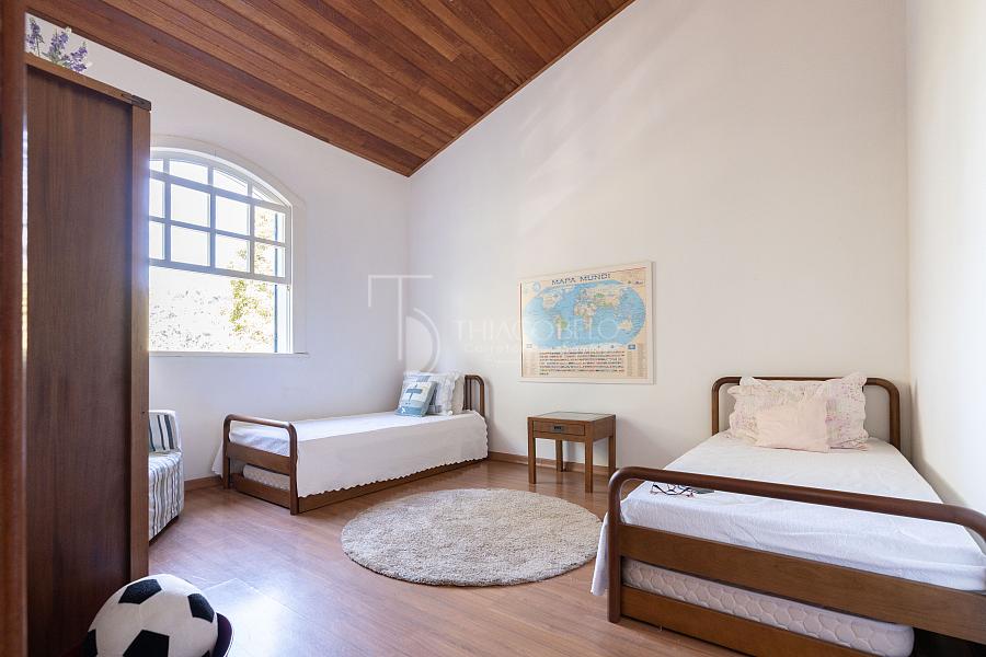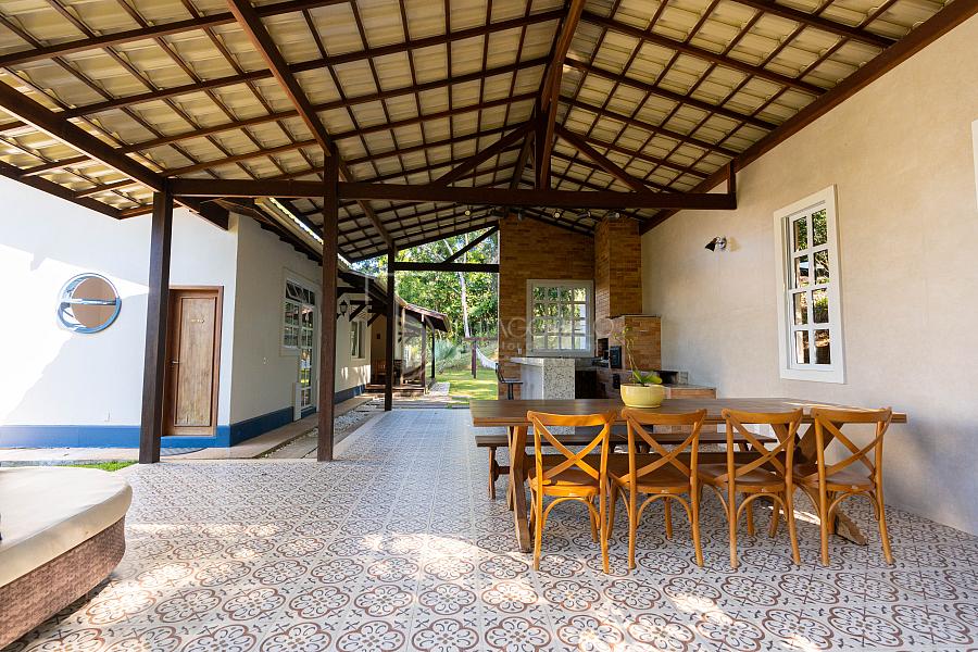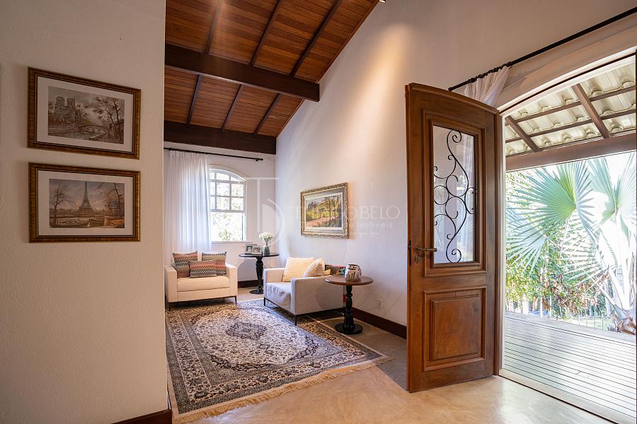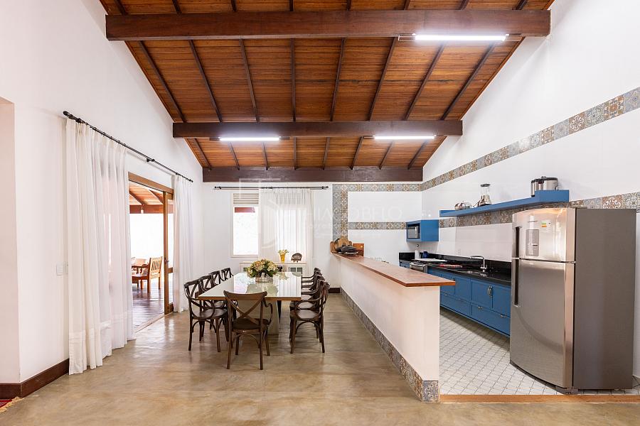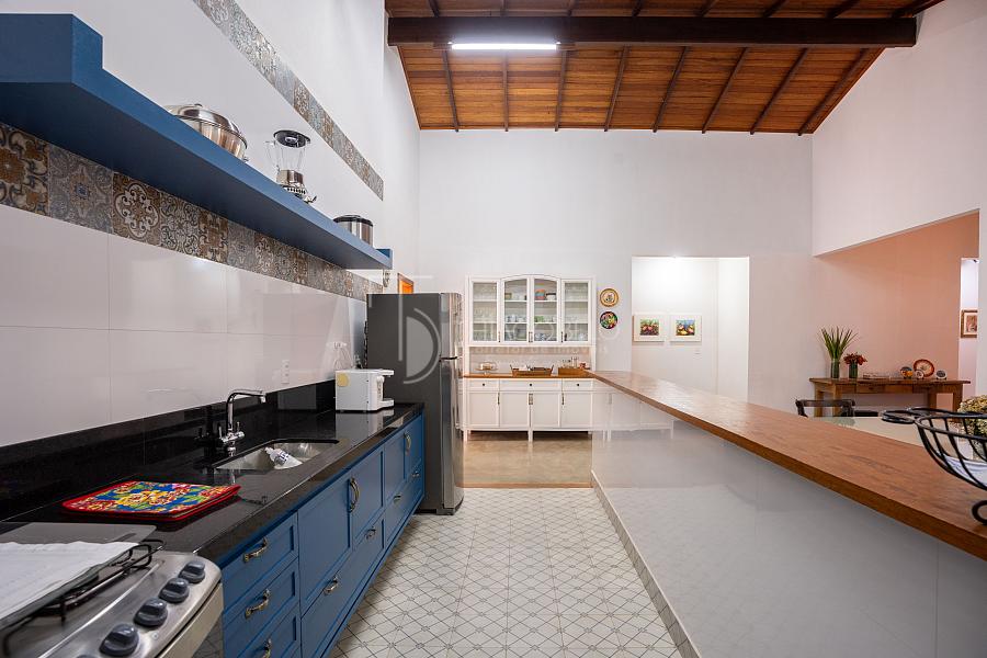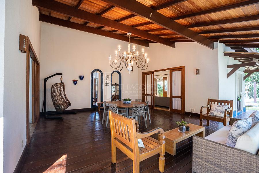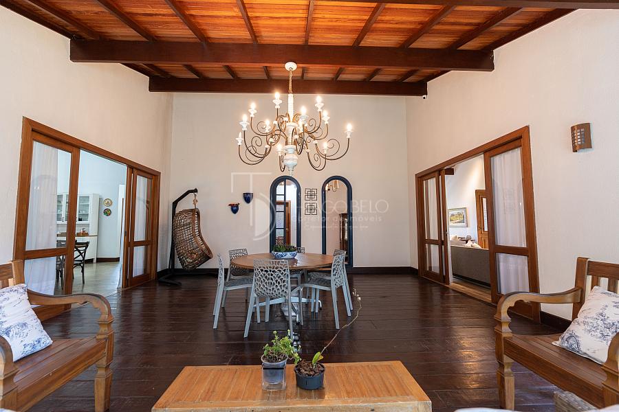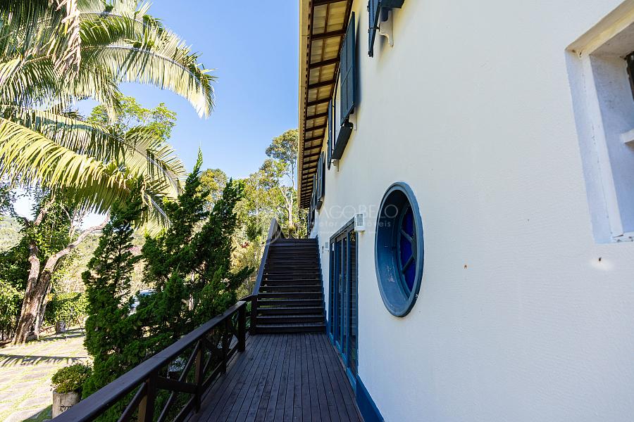 A propriedade conta com 700 m² de construção em um terreno de 3.800 m². O térreo dispõe de uma suíte e uma dispensa. O primeiro pavimento inclui varanda em L, duas salas, quatro quartos (sendo duas suítes), três banheiros e uma copa e cozinha em conceito aberto.