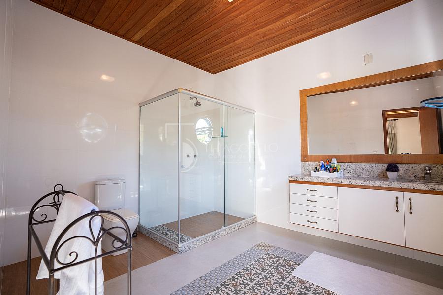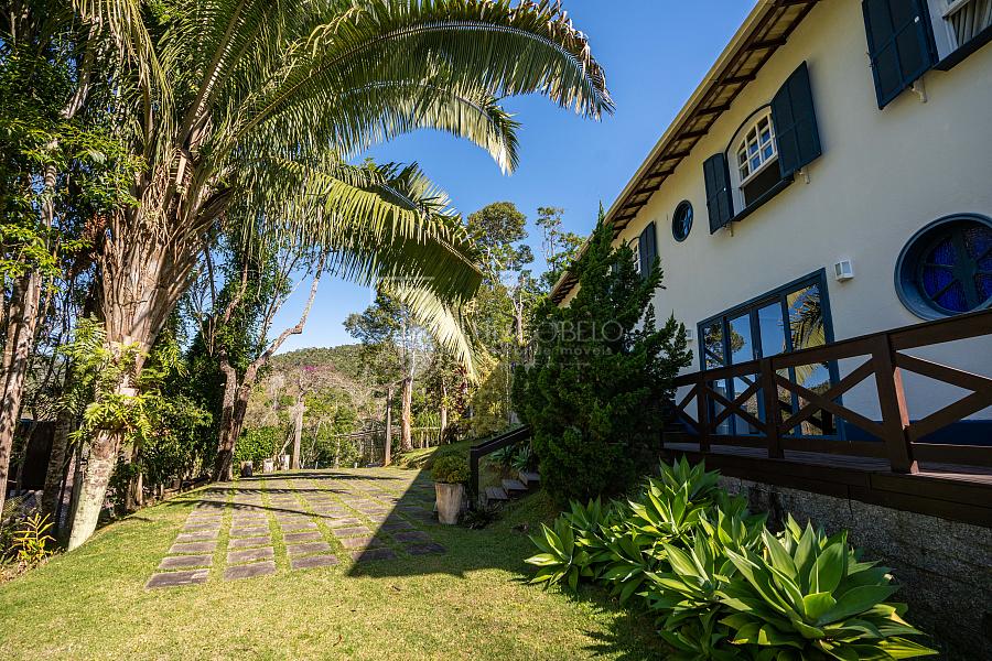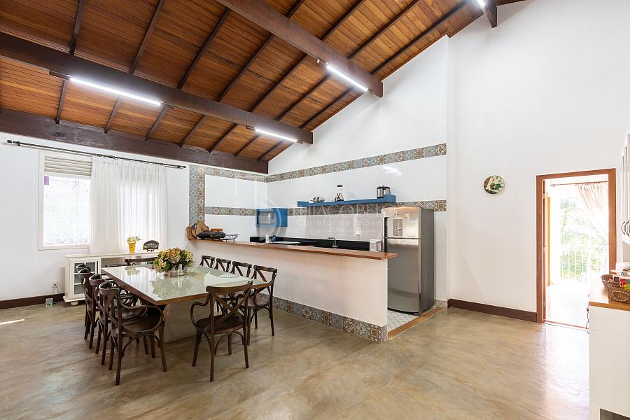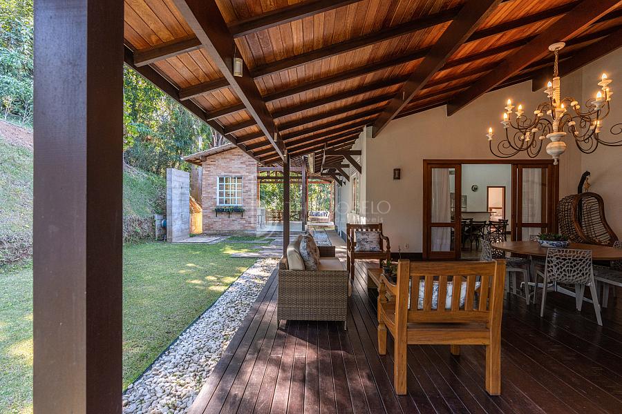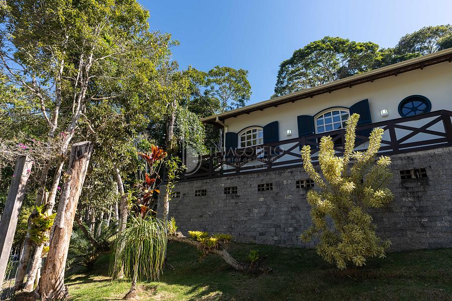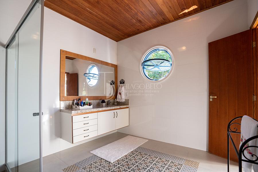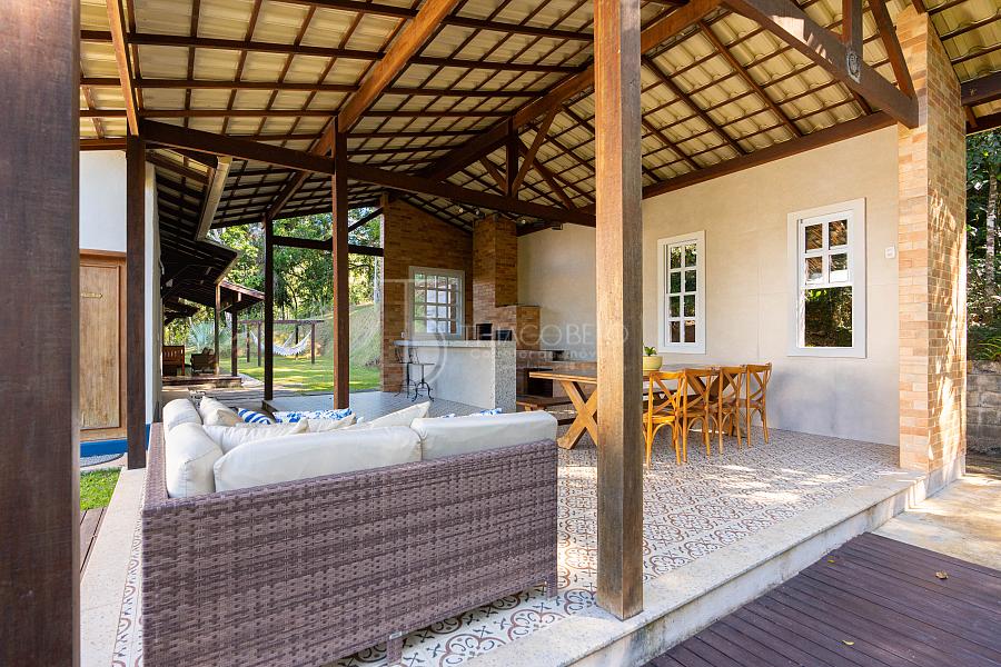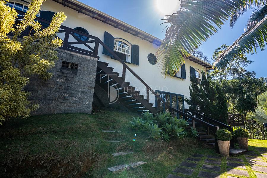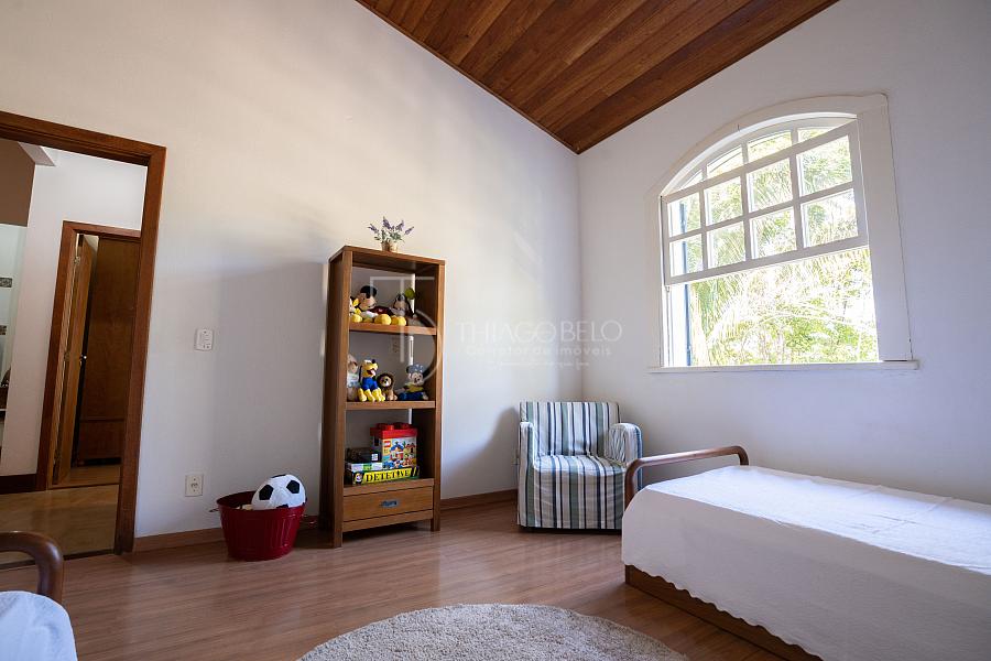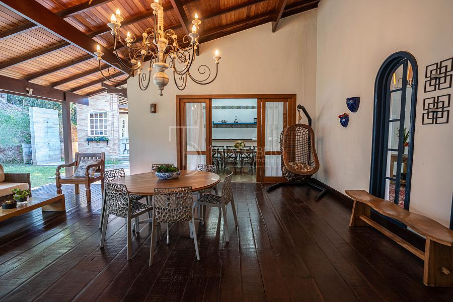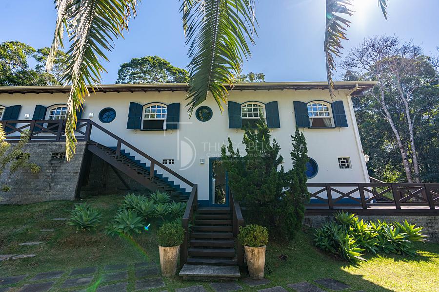 A propriedade conta com 700 m² de construção em um terreno de 3.800 m². O térreo dispõe de uma suíte e uma dispensa. O primeiro pavimento inclui varanda em L, duas salas, quatro quartos (sendo duas suítes), três banheiros e uma copa e cozinha em conceito aberto.