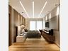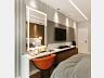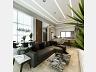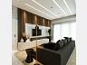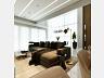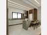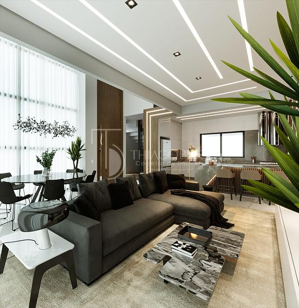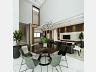 Sala de estar/jantar com pé direito duplo e parede de vidro do chão ao teto;
