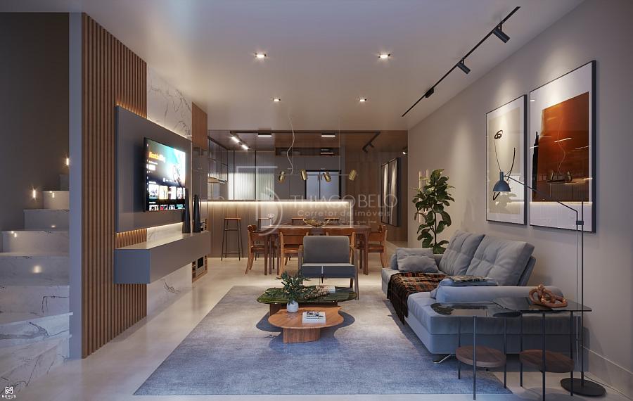 A integração entre os ambientes é o destaque deste projeto. O hall de entrada, por exemplo, oferece uma vista total para o quintal privativo, trazendo a sensação de leveza e conexão com a natureza para dentro da casa.