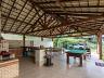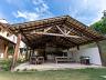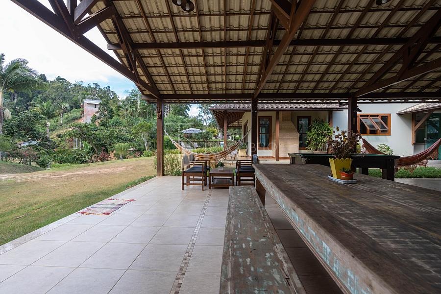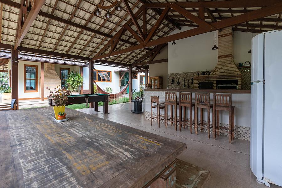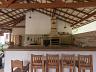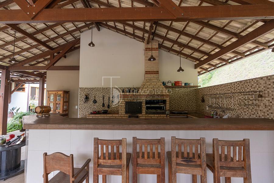 A área externa é perfeita para churrascos, com uma cozinha bem equipada, fogão a lenha e uma grande mesa rústica que acomoda uma grande família ou um grupo de amigos.