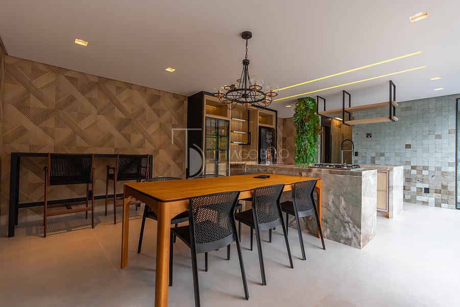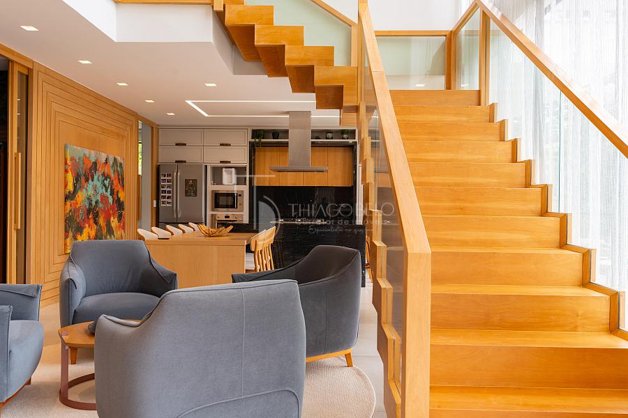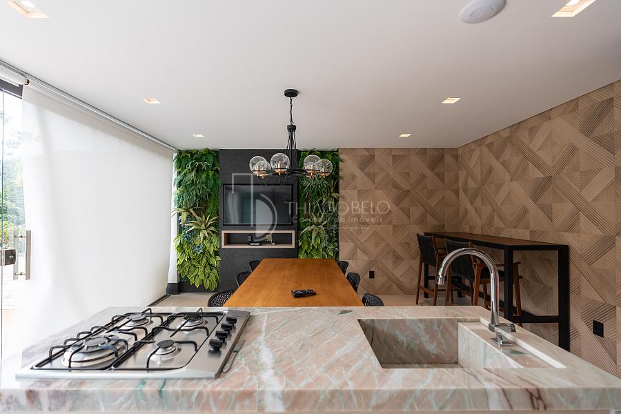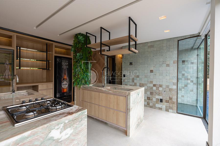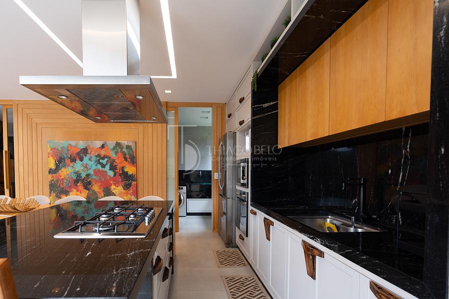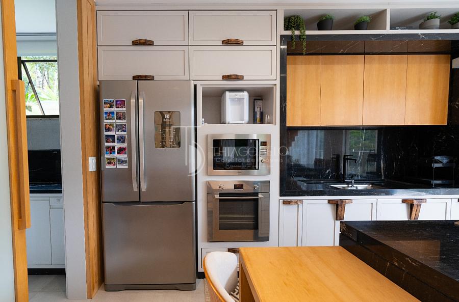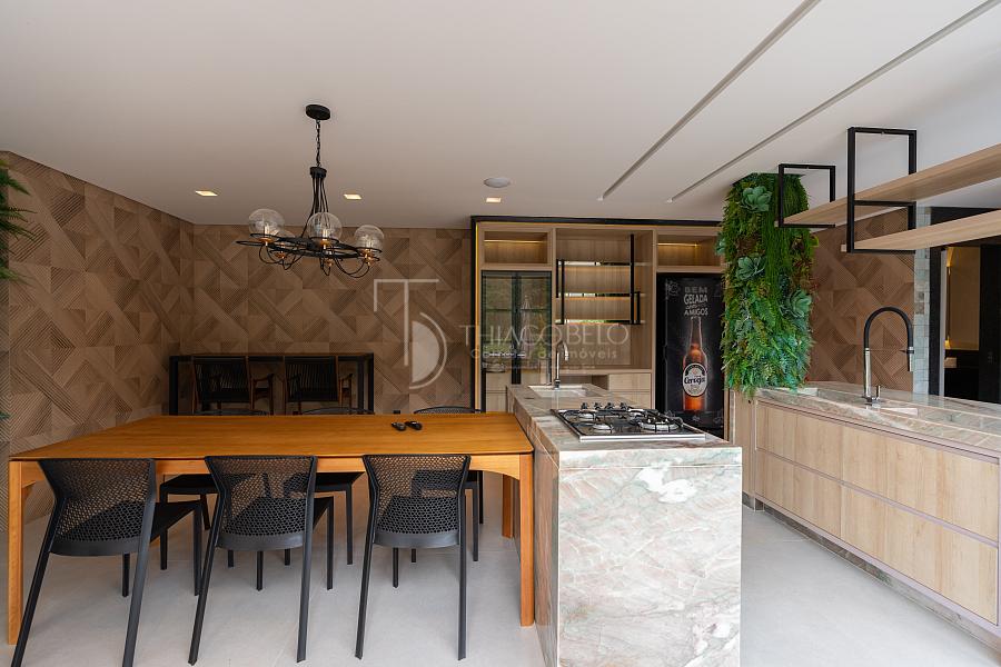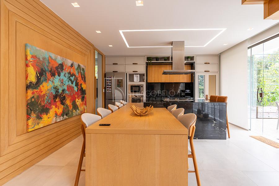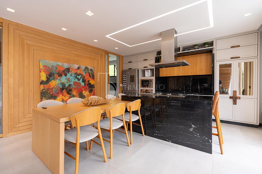 A casa oferece 5 suítes, sendo 2 delas com closets privativos, garantindo privacidade e conforto para todos os moradores e convidados. A cozinha, em conceito aberto, é um convite à culinária gourmet, equipada com os mais modernos aparelhos e uma ilha central para preparar suas refeições com estilo.
