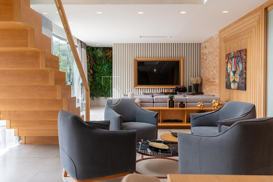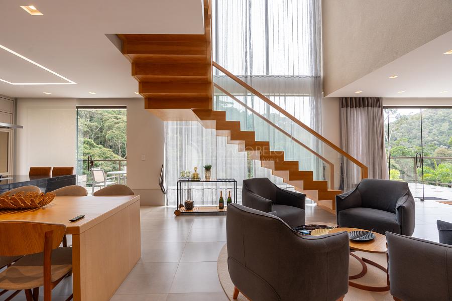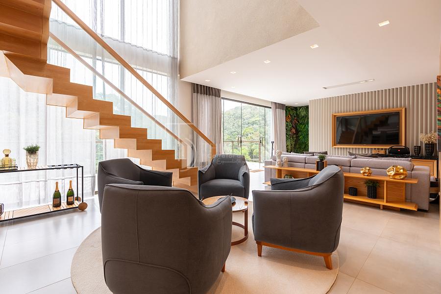 Ao adentrar a casa, você será recebido por um espaço luminoso e arejado, graças ao pé direito duplo que se estende por toda a sala principal. Esta sala de estar espaçosa proporciona um ambiente acolhedor para momentos de convívio e relaxamento.