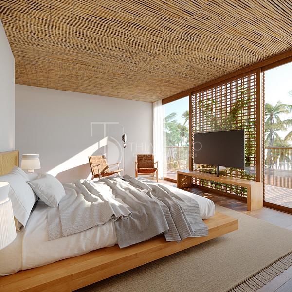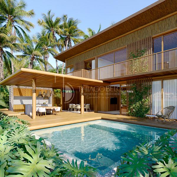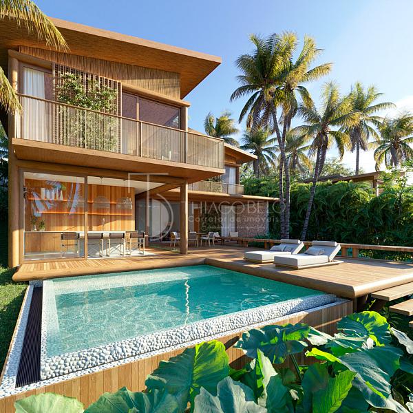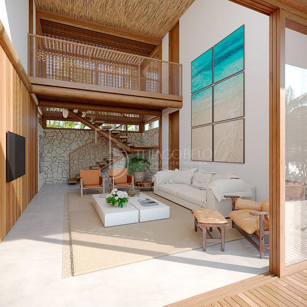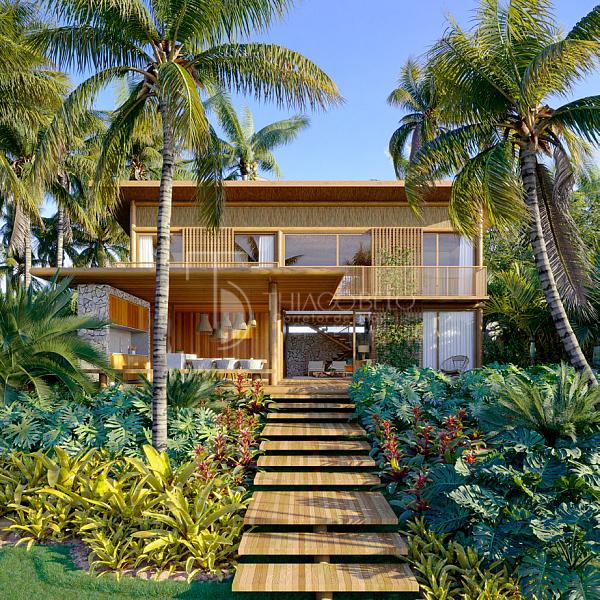 Tendo a madeira como protagonista, o cimento queimado surge nos pisos e bancada dos banheiros. Já a tala de dendê (esteira de fibra natural) reveste o forro dos telhados e acabamentos, fomentando artesãos e a mão de obra local. Com conceito de sustentabilidade, os eucaliptos das madeiras de reflorestamento vêm da própria região sul da Bahia. Aproveite a proximidade com o mar e os principais pontos centrais de Arraial D'Ajuda.