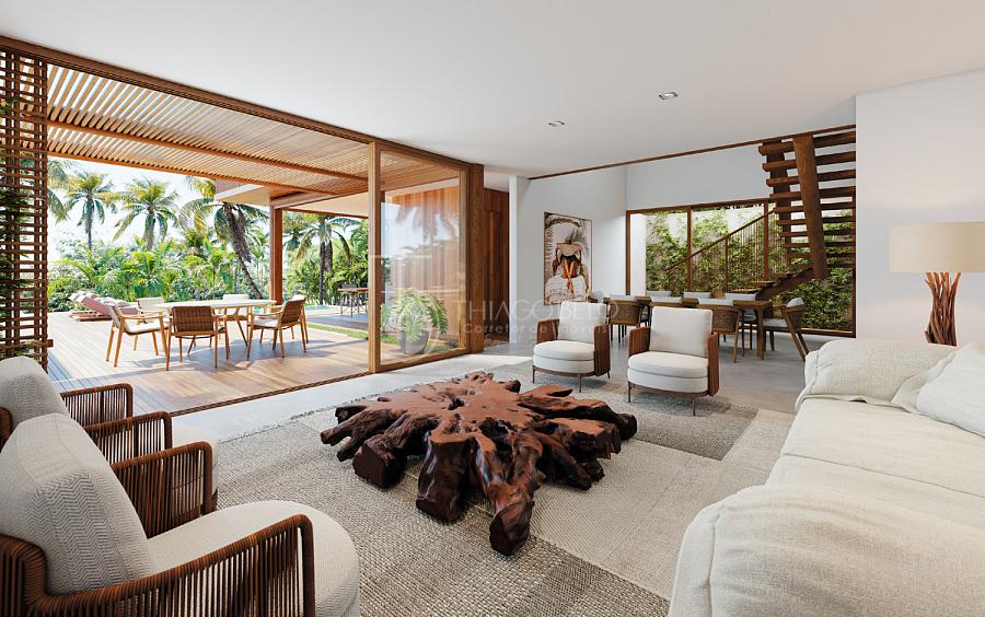 As residências emprestam os êxitos da arquitetura vernacular para moldar um ambiente confortável e fresco, com pleno conforto: piscinas privativas com deck, área gourmet e amplo living. As propriedades são arrematadas por telhados de uma só água, cujo desenho foi inspirado nas asas dos pássaros, que sobrevoam a região. As espécies da mata atlântica, acostumadas ao clima e ao solo, criam simbiose com o projeto e sua vegetação.