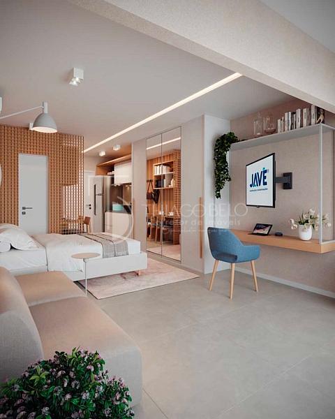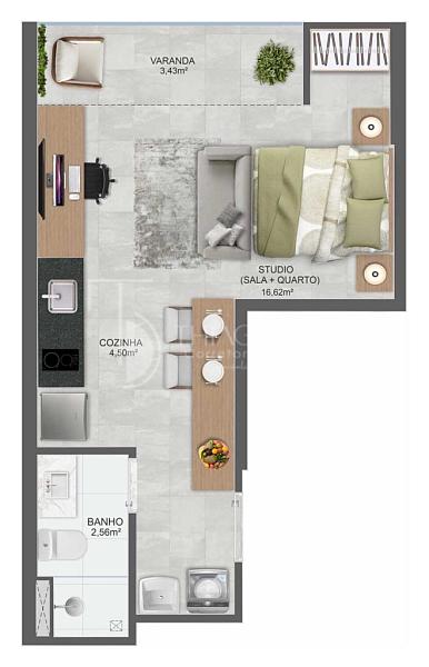 - Studio (sala/quarto, cozinha, varanda e banheiro) com área privada de 27,11 m²